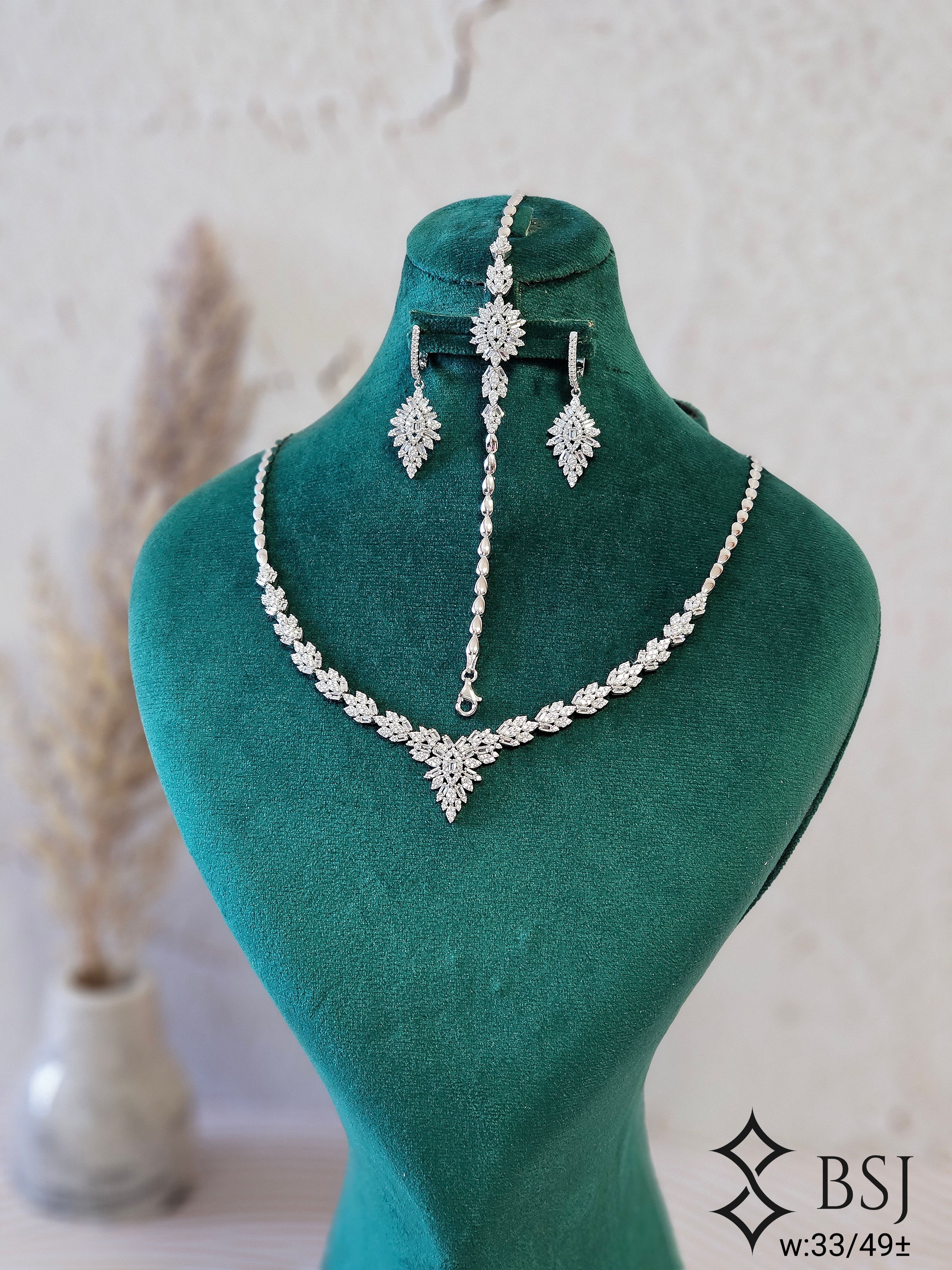 سرویس نقره GT103 یکی از شیکترین و خاصترین مدلهای موجود است که با الهام از طرح گندم و با چیدمانی بسیار ظریف و هنرمندانه طراحی شده. این سرویس شامل گردنبند، دستبند و گوشواره است و نگینهای برلیان اتمی زیرکونیوم روی خطوط گندمی آن نصب شده تا جلوهای خیرهکننده و کاملاً مشابه زیورآلات طلا ایجاد کند.
